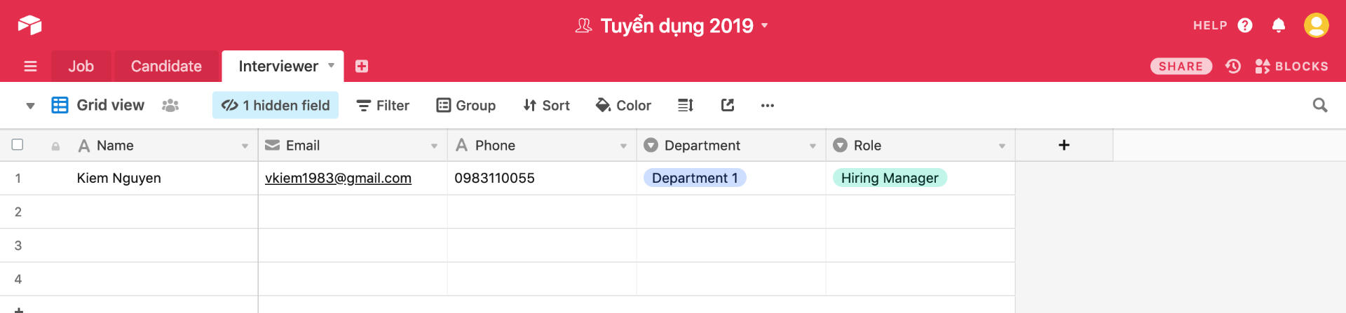 Cơ bản thì các bạn không cần tạo Interviewer table, tuy nhiên trong phần hướng dẫn này mình tạo ra để giúp các bạn hình dung cách Airtable liên kết dữ liệu với nhau như thế nào.Trước tiên là cũng tạo fields dữ liệu cho InterviewerName - Single line text