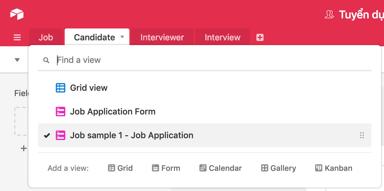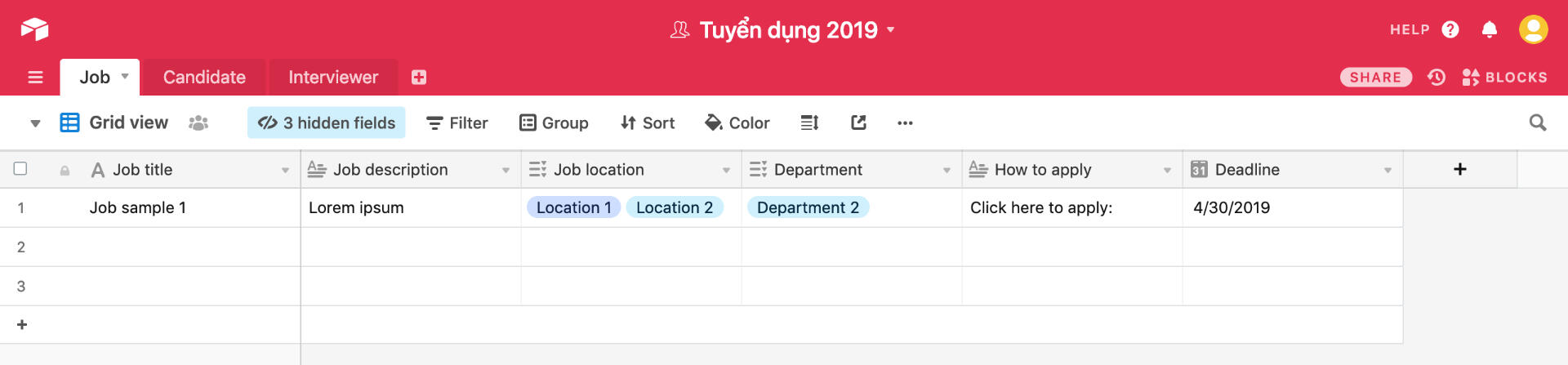 3 - Trong Tuyển dụng 2019 mình sẽ tạo các Table là Job, Candidate, InterviewerTrong từng Table mình sẽ setup các field để thu thập và lưu trữ nhiều loại dữ liệu khác nhau, nhưng trước khi setup field thì cá bạn qua bước kế tiếp để hiểu thêm về field là cái gì nhé.