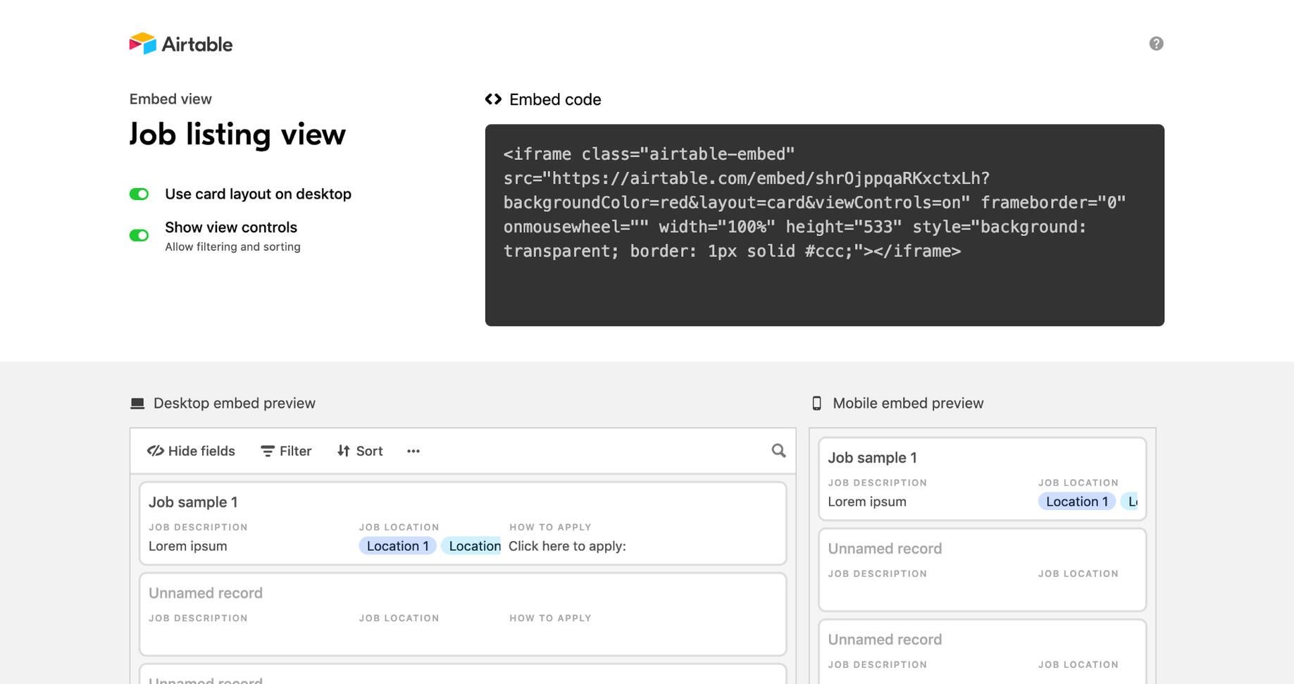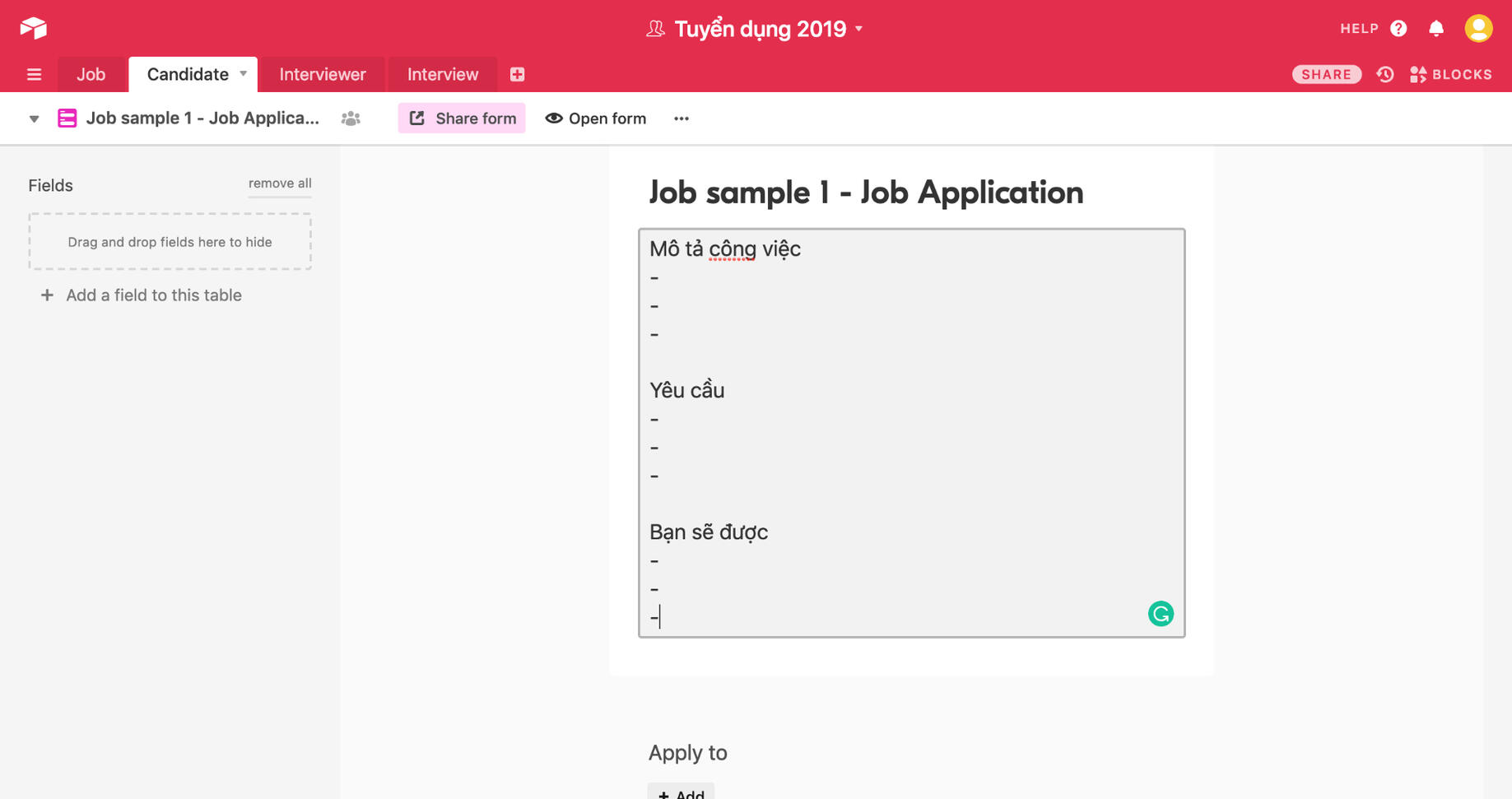 Với Airtable, các bạn có thể nhập thông tin trực tiếp, hoặc tạo Form để người khác có thể nhập thông tin mà không truy cập vào trong database của bạn.TẠO FORM YÊU CẦU TUYỂN DỤNG