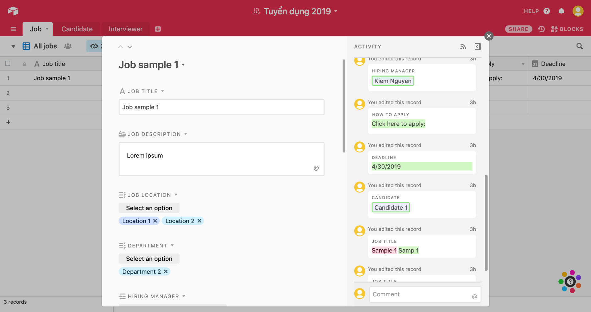 3 - Trong Tuyển dụng 2019 mình sẽ tạo các Table là Job, Candidate, InterviewerTrong từng Table mình sẽ setup các field để thu thập và lưu trữ nhiều loại dữ liệu khác nhau, nhưng trước khi setup field thì cá bạn qua bước kế tiếp để hiểu thêm về field là cái gì nhé.